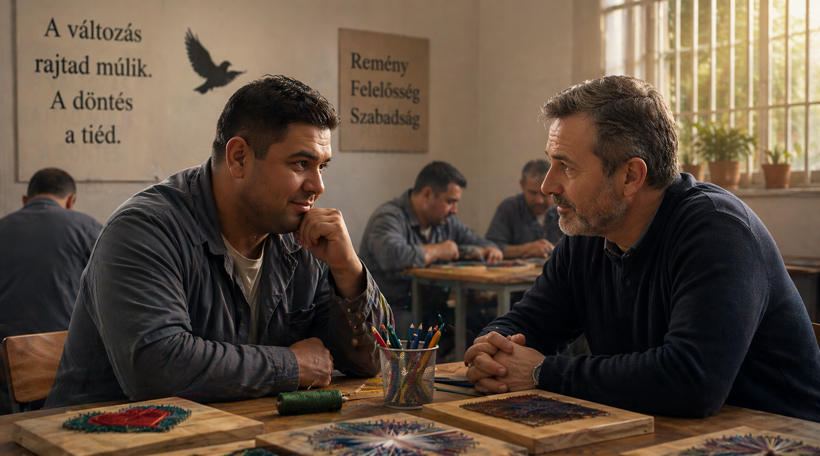 Elkezdtünk beszélgetni az érzésekről, és először dacosan próbálta igazolni, hogy amit leírt az így lesz, ő többé nem akar ide visszakerülni, ezért szót fogad a pszichológusnak. Hogy a feszültséget oldjam, elmondtam, hogy nem kétlem a szándékát, de játsszunk el a gondolattal: mit tesz, ha kinn lesz, munkája továbbra sem lesz, és megjelenik egy jó ajánlattal a díler, aki miatt többször idekerült már.