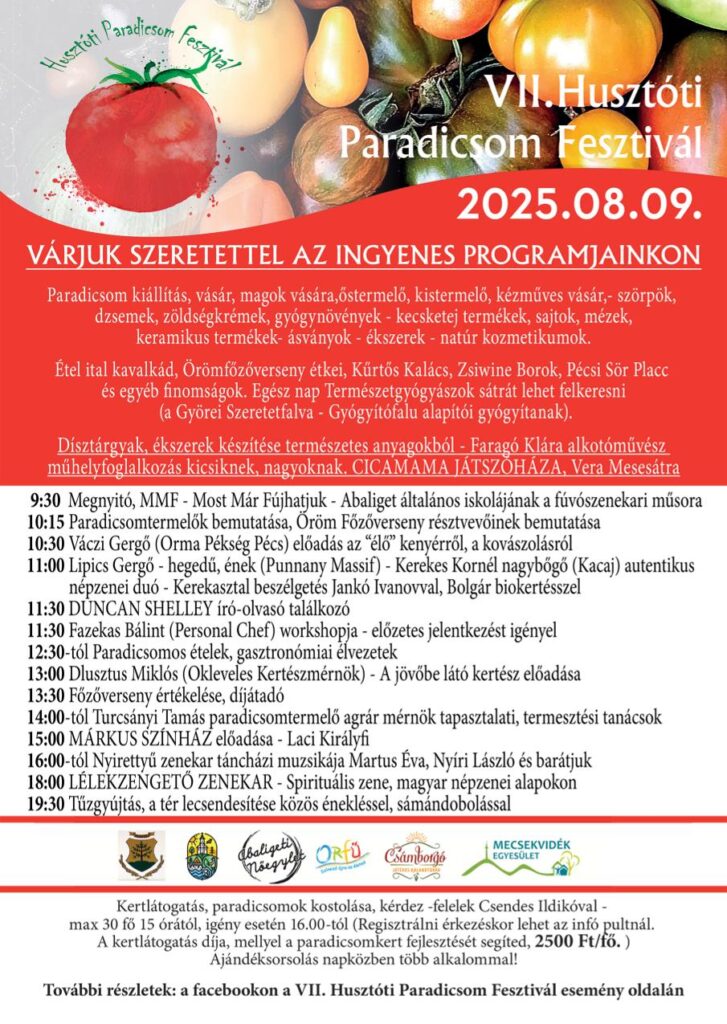 2025.08.09-én gyertek el Husztótra, a Paradicsom Fesztiválra, ahol egyesületünk tagjaitól tudtok kérdezni, beszélgethettek velünk arról, hogy mivel foglalkozunk, megnézhetitek a későbbi kézműves foglalkozásokon elkészíthető tárgyakat, esetleges adományaitokért cserébe pedig ajándékkal kedveskedünk Nektek!